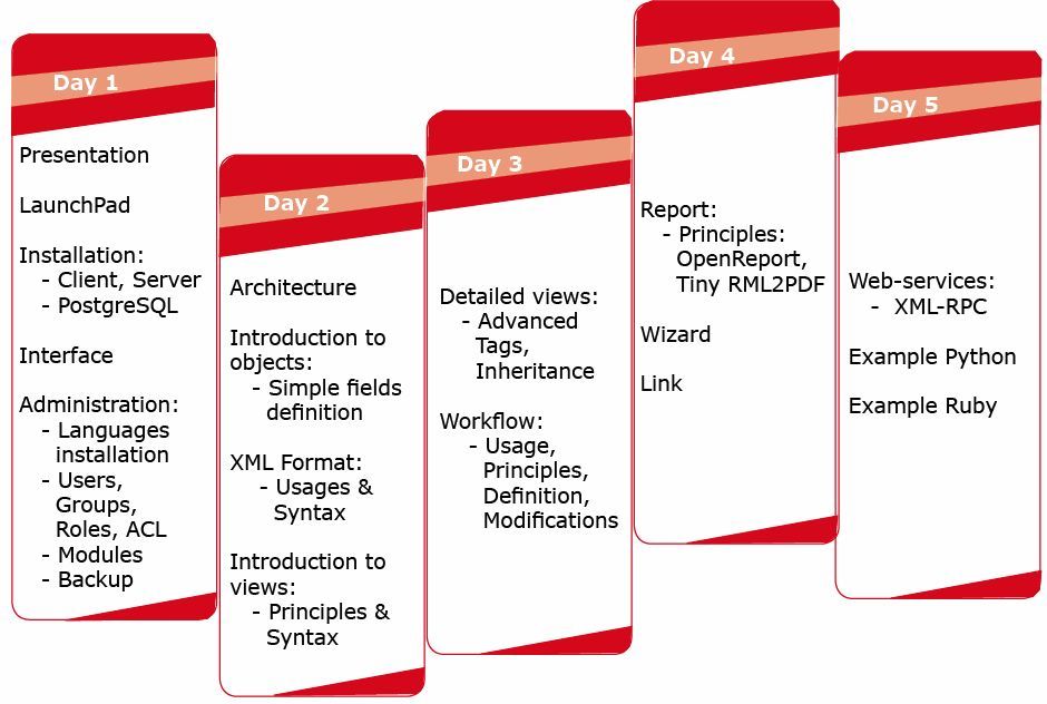 Participants are expected to have a basic knowledge of the Python programming language and an Integrated Development Environment such as Eclipse. Participants preferably have a functional knowledge of the OpenERP software (see Functional Training).