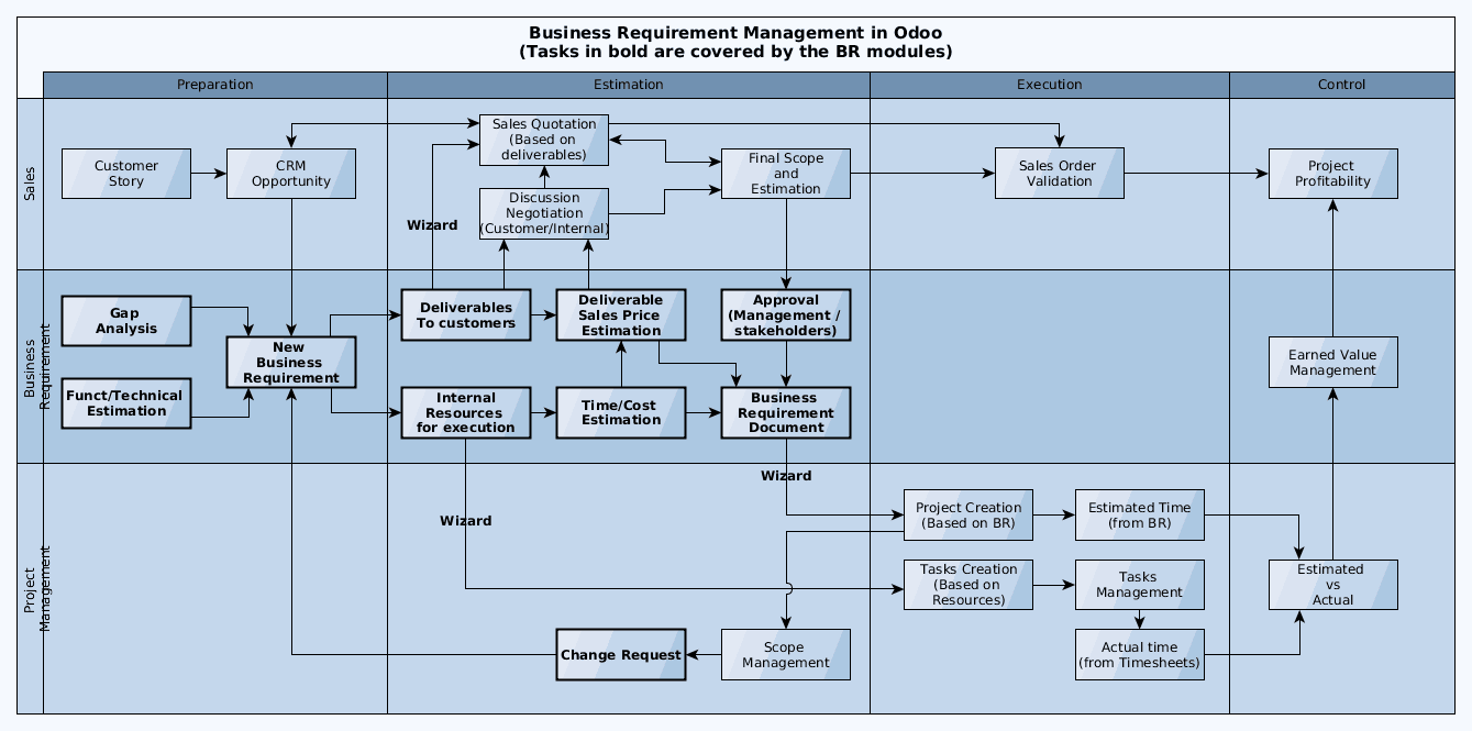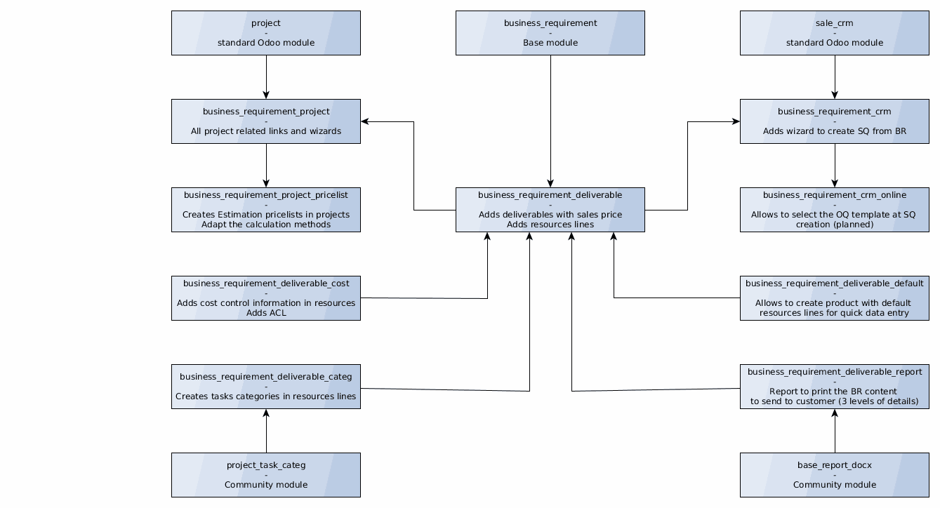 Many contributors expressed their interest such as Jordi, Daniel or Pedro and we started the design of the new set of modules first with a rebranding ("Gap Analysis" had a too narrow definition compared to "Business Requirements") and the objective to fit a broader audience.