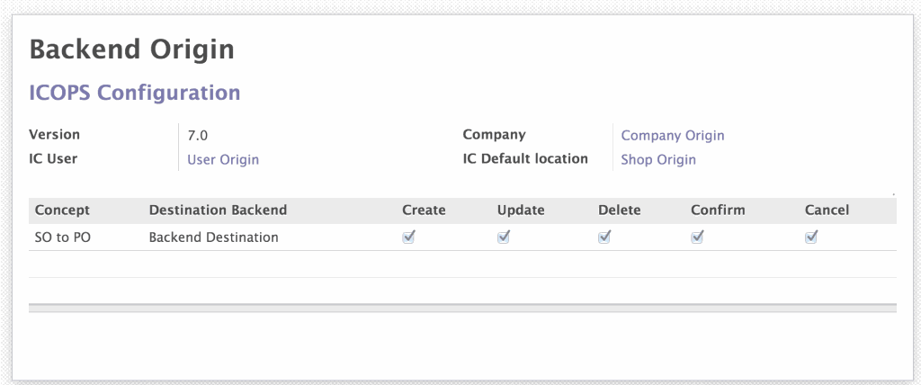 - Go to connector/ backend and create the setup in Backend Origin (eg PO to SO: create, update, delete and confirm)