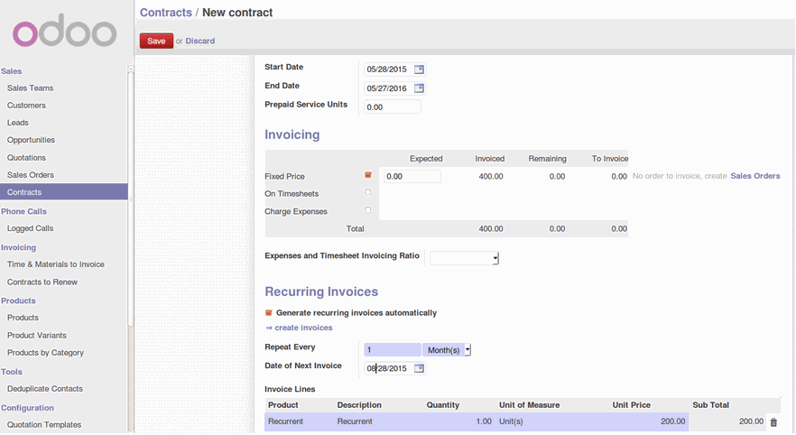 2. Create the SO with the 2 products (one time fee and recurrent), assign the recurrent contract and validate the SO.