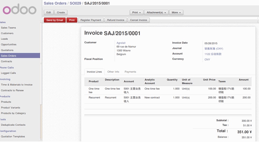 3. Create the Sales invoice. 4. Modify the draft invoice and change the AA for the product "One Time Fee".