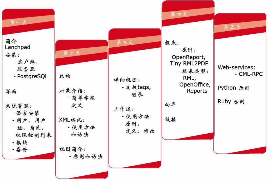此开发培训的目的是掌握OpenERP的技术: 安装OpenERP, 使用现存模块,安装模块,OpenERP管理, 改写现存模块,管理某些对象如视图,工作流,向导,报表及与其他程序接口等。